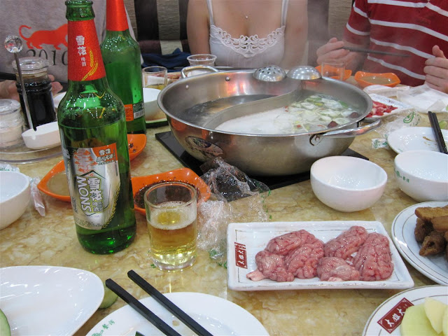And then we went to a hotpot restaurant. Which is…exactly what it sounds like. You go down a buffet of raw meat, tofu, and vegetables and put them on your tray and each of the plates of food has a price painted on the plate. You get as much food as you want and at the end of the meal, the server adds up all of your plates. At the table, there is a huge pot of boiling water (and boiling soups and such). You then drop whatever food you want to eat into the pot, wait a little bit depending on the type of food, and then enjoy in a variety of dipping sauces.
