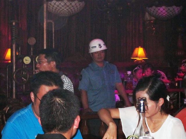 Not only do you get a personal assistant for the night. There are security guards all over the club. They all look the same, no matter what bar. White plastic hat and a disapproving look on their face. Surely thinking to themselves, "This is not what my grandfather intended." Here's a fairly crappy picture I took of one: