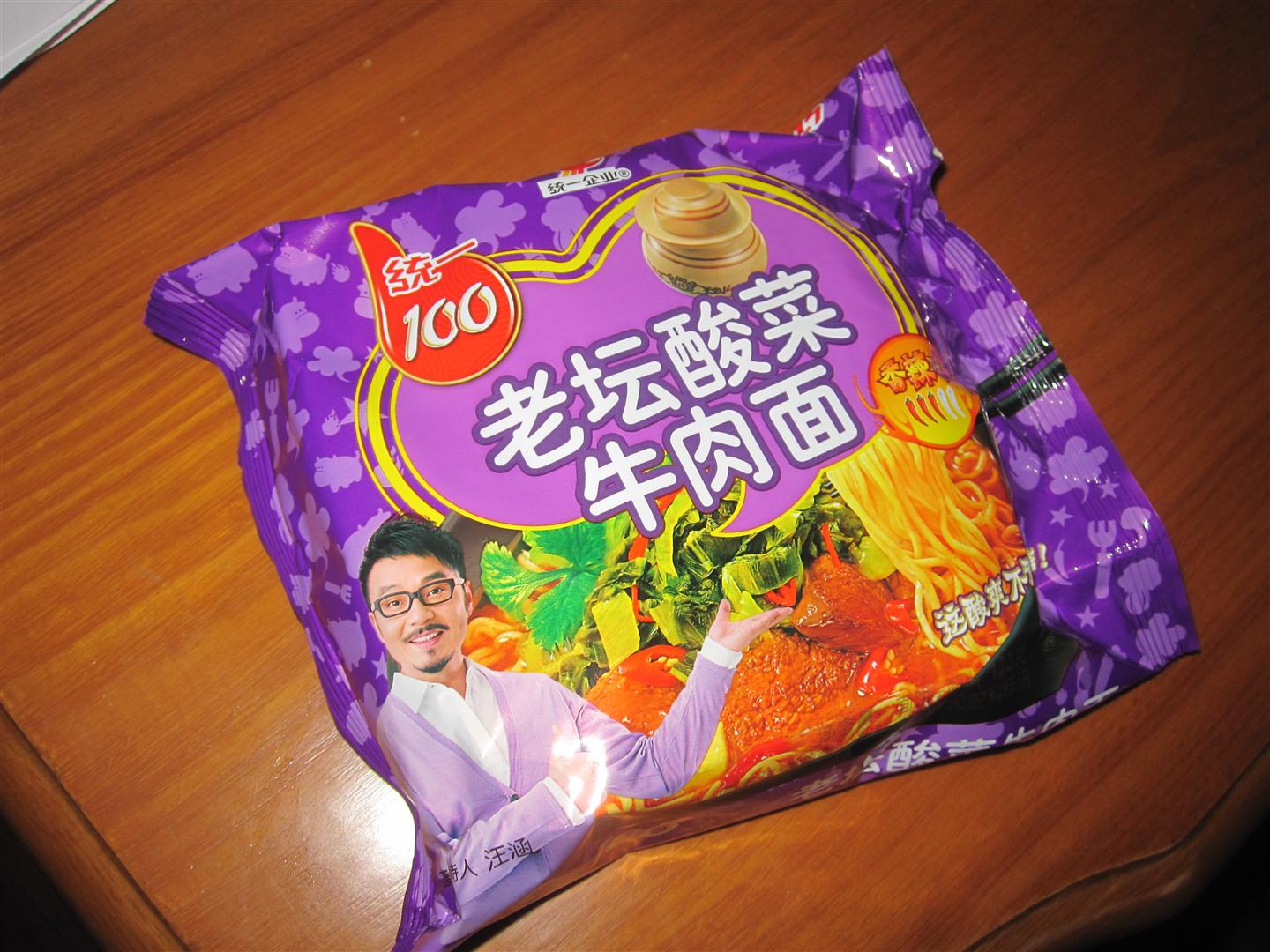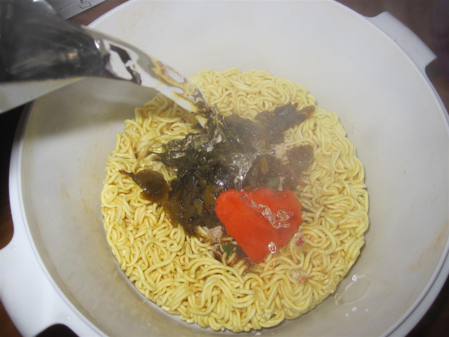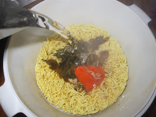 Not one, not two, but THREE packages for maximum flavor potential. The silver package contains bit of dried vegetables and the standard MSG mix that comes with most instant noodles. The red package contains an oil and spice mixture. And the purple package contains the secret ingredient for these particular noodles: the pickled vegetables.