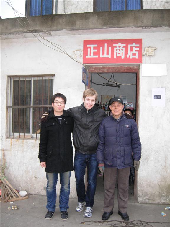 In front of his father's store. Note that the store is named "正山商店" which is the Chinese equivalent of "David Smith's Store" |